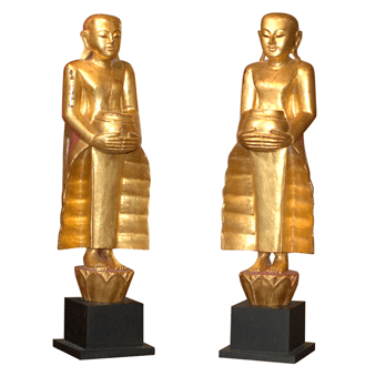 Gilded Burmese Temple Monks with Offering Bowl, late 19th century Teak carved figure of a monk from Burmese Buddhist Temple. Newly gold leafed which is common for temple pieces so they are maintained in pristine condition. The monks are standing on a lotus blossum mounted on a wood plinth. (Added later) In superb condition since gold leaf was done just prior to purchasing in Burma 10 years ago. Rear of piece not leafed since it was not seen and gold so expensive for the people. 10"w x 8"d x 34"high
