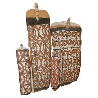 New Guinea Ceremonial Shields, Circa 1900 Ceremonial warrior shield with vegetable dye pigment coloration and geometric designs. Some with carved figures at top. New Guinea /Irian Jaya, circa 1900 Assorted sizes available