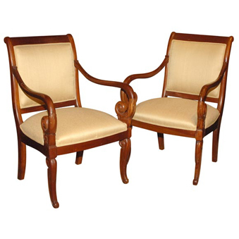 Pair of Mahogany Arm Chairs Restored frames which have been newly upholstered with Henry Calvin Twill in a pale green. Curled arm with minimal scroll carving. Delicate back with slight scrolled top motif and cabriole leg. 24"w x 26"d x 36"h