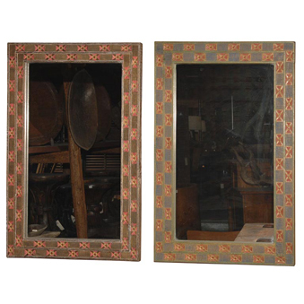 Hand carved and Stained Teak Mirrors Solid teak hand-carved mirrors with X motif that has been stained in soft colors. Great vanity mirrors to mix and match over double sinks. Beautifully executed. Each is colored differently 23 1/2" wide x 1 1/2" deep x 35" high