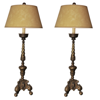Swedish Pricket Brass Candlesticks Made into Lamps Solid brass candlesticks wired as table lamps. Tripod base with cherub masks supporting a turned column to candleholder top. Beeswax Candle cover below socket. Newly wired with 3-way and line switch. Paper shade included Height: 48", Diameter: 6"