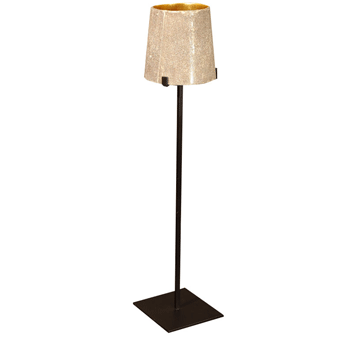 Studio JRM Tubular Bronze Tall Lamp with Shagreen Shade Tall accent lamp with shagreen shade lined in gold. Shade supported by bronze brackets. Great for a mantle or entryway. Takes candle bulb. Height: 25", Diameter: 5 1/2"