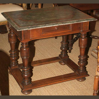Rare Country Louis XIV Walnut Table with Painted Top France, circa 1840. Beautiful table patinee with balustrade legs and molded base stretchers. Bun feet. Single drawer with wood pull 32w x 23d x 28 1/2h