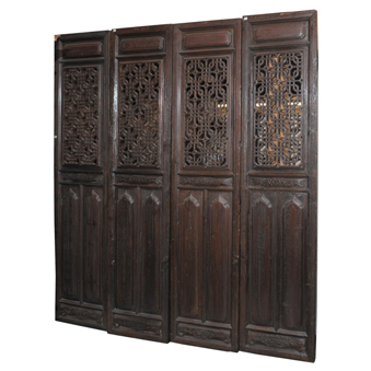 Set of 4 Carved Chinese Panels, 19th Century Set of 4 tall chinese panels which could be used as a room divider or wall back drop. Open fretwork on upper section with recessed panels at base. Each panel 98"tall x 22 1/2" wide . Combined width 90". Height: 98", Width: 22 1/2", Depth: 2"