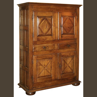 Louis XIII Walnut Cabinet France, circa 1780-1820 With 4 doors and 2 drawers. Losange decoration on upper door fronts with X motif on base door fronts. Single panel wood fronts on doors. Bun feet/paneled sides. Center stationary stile on top or bottom could be easily modified to accomodate TV. 54"w x 24"d x 75"h