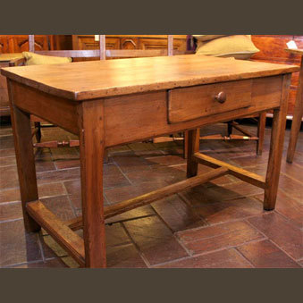 Pine Table with Single Drawer French Alpes, near Grenoble, France. Circa 1890. Side and center stretcher. Single drawer with wood pull 45 1/2"w x 25 1/2"d x 28 1/2"h
