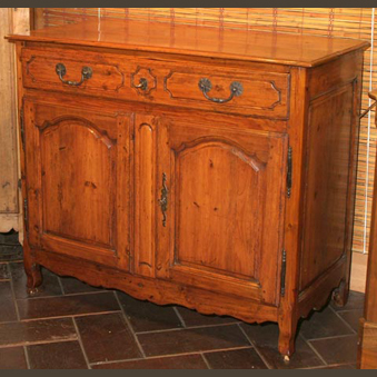 Pine Buffet France, Circa 1880 Louis XV style with single top drawer with cupboard base. Paneled sides and original drawer pulls in pewter. 37"w x 22 1/2"d x 39 1/2"h