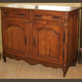 Louis XV Country Walnut Buffet with 2 drawers France 1790-1810 Provencial Walnut Buffet. Unusual height. Pewter hinges and drawer pulls. Escargot feet with simple carving outlining base. A beautiful and elegant French Country piece. 57"w x 23"d x 45"h