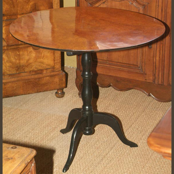 Danish Birchwood Veneer Tilt Top Table Birch Burl Veneer top surface. Base of top / column and tripod feet are ebonized birch. 34 3/4" diameter x 31" h